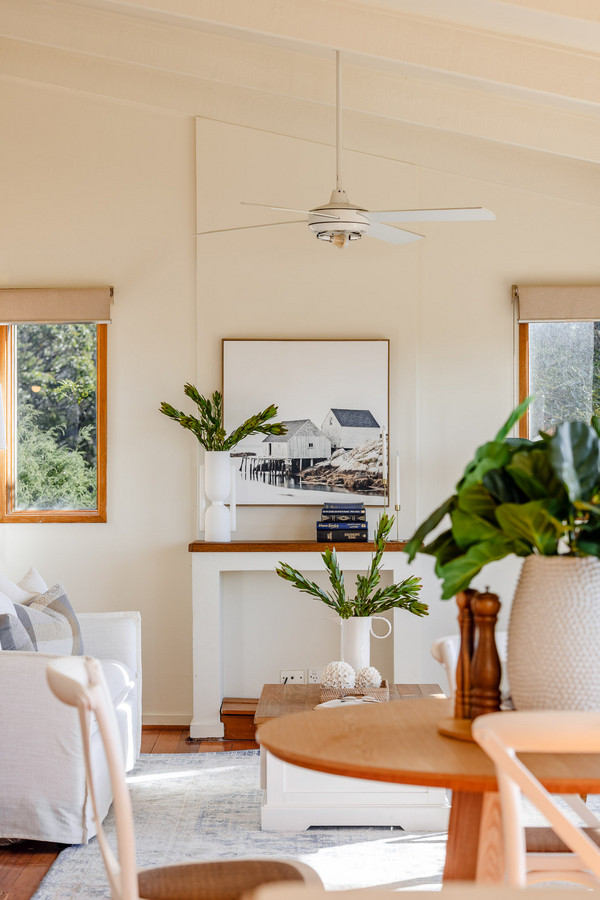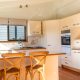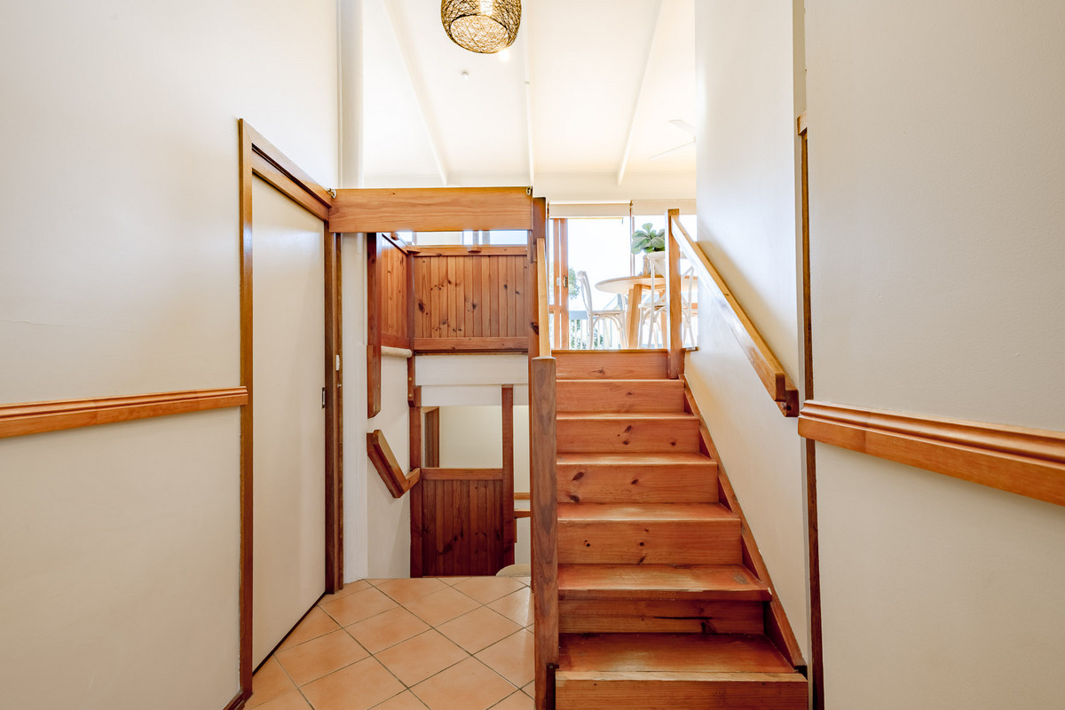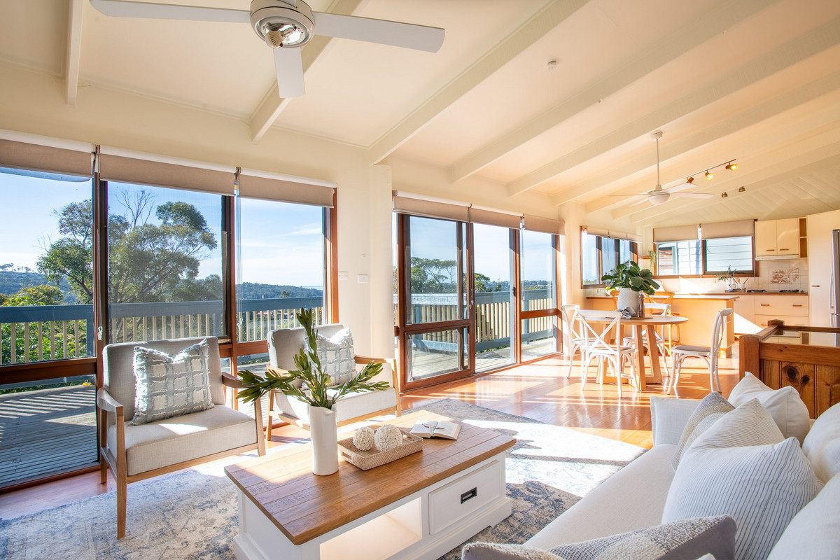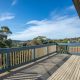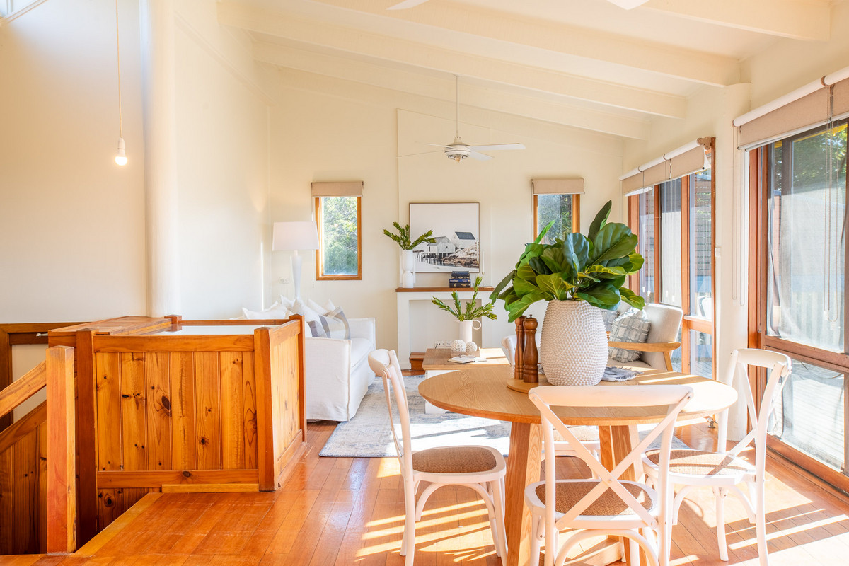 There’s an immediate sense of space and light inside from the home’s high, raked ceilings and plenty of retro charm from the original timber features. The open-plan living space is located on the upper level and is flooded with natural sunlight. It receives great airflow from large windows and doors right along its north-eastern aspect. The beautiful elevated views out over Merimbula Lake towards the Long Point headland, provide a stunning backdrop to the kitchen, living and dining areas and are best enjoyed from the large sun-bathed entertaining deck with your choice of drink in hand. The upper level is also the perfect vantage point to check what the kids are up to in the backyard below.