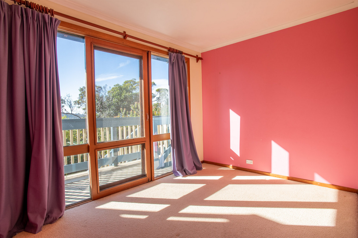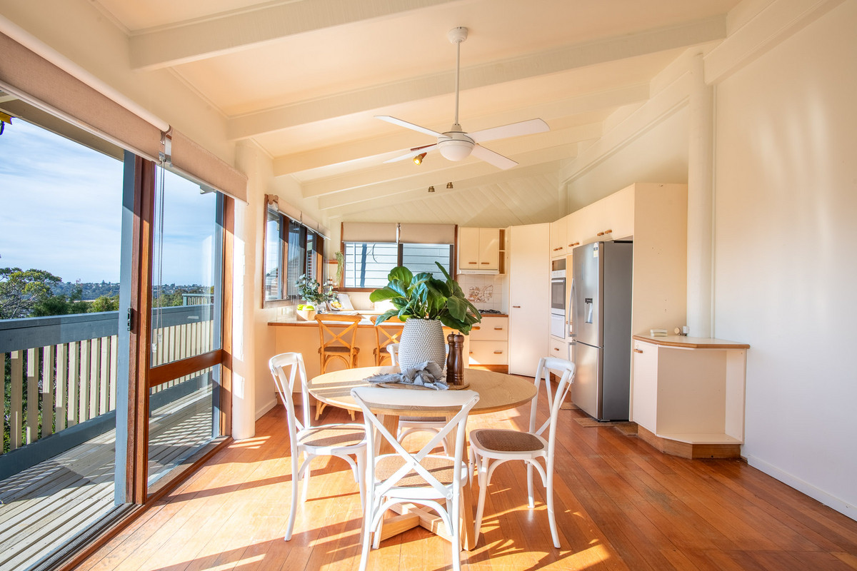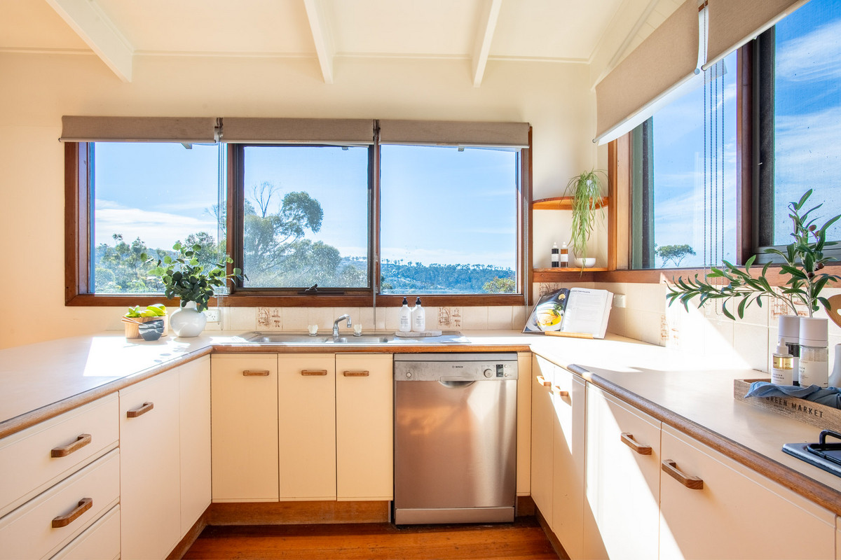 With original floorboards and other features throughout including timber windows and exposed ceiling beams this house has a quirky, 80s retro feel. The original kitchen is large and functional and includes a gas cooktop, electric oven, dishwasher, breakfast bar and those beautiful panoramic views from the kitchen sink.
