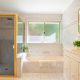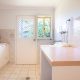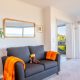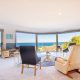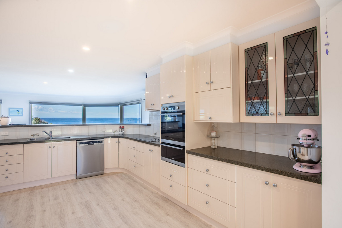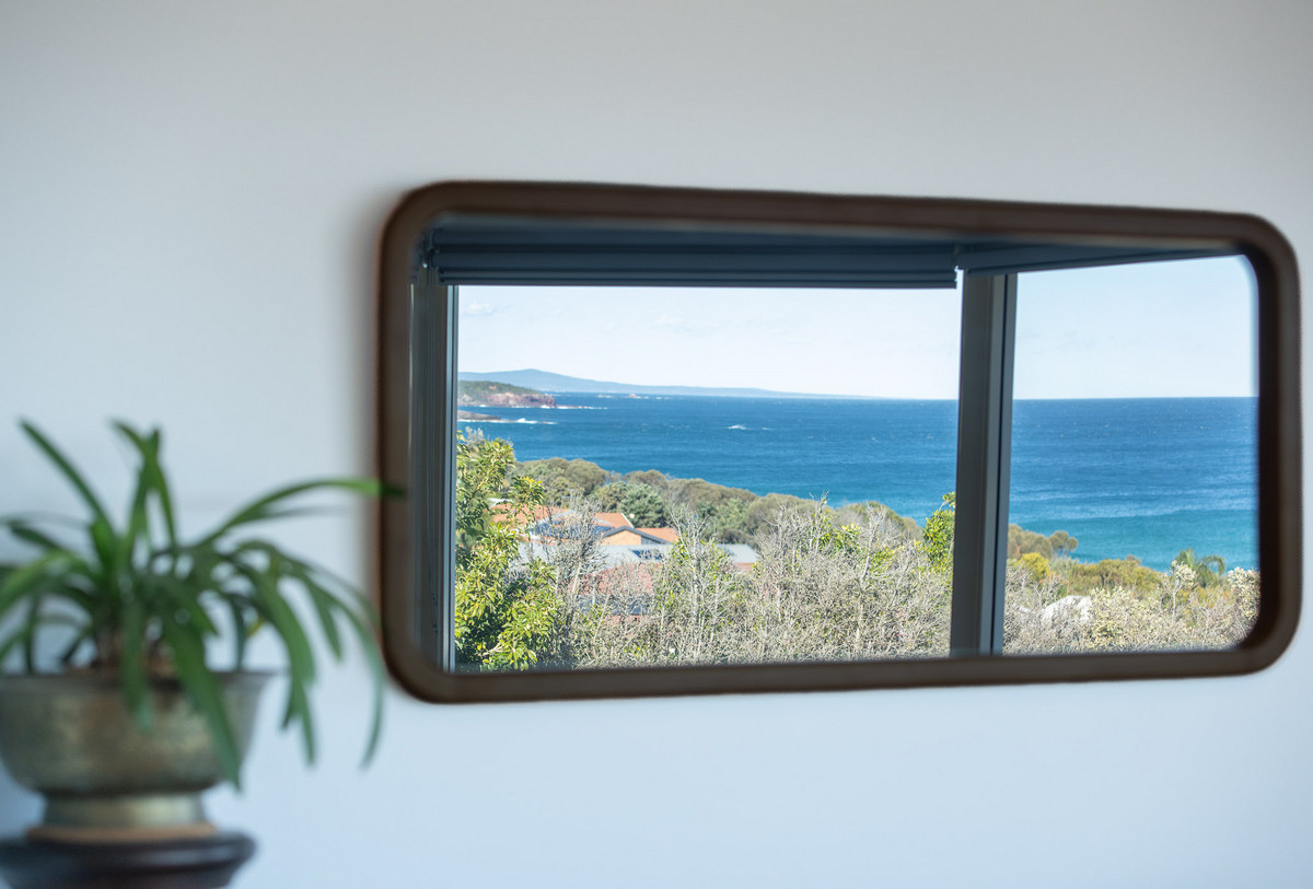 The home’s spectacular south-eastern vista toward Merimbula’s Short Point Headland allows you take in the sunrise, check the surf and watch the weather roll in all from expansive floor-to-ceiling windows in the large, open-plan kitchen, dining and loungeroom. The balcony off the loungeroom is an idyllic breakfast spot to take in the fresh ocean air and let the serenity of the view wash over you before starting your day.