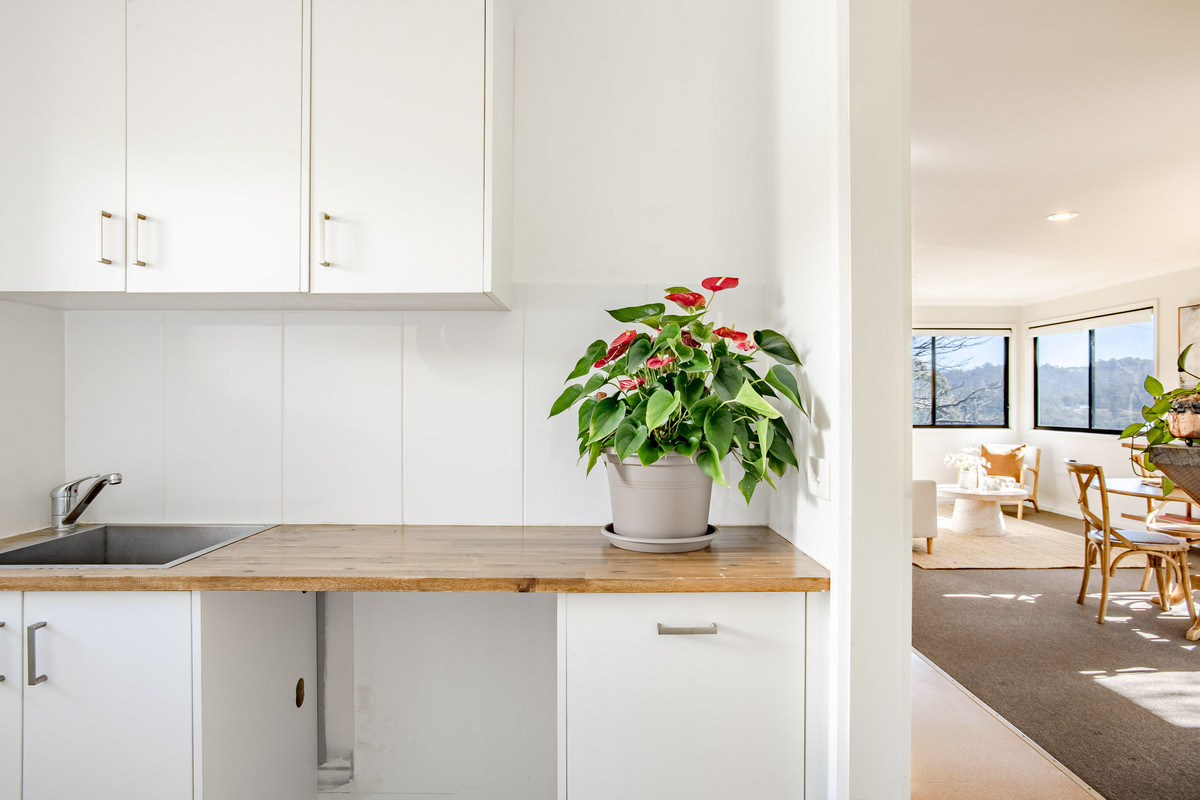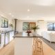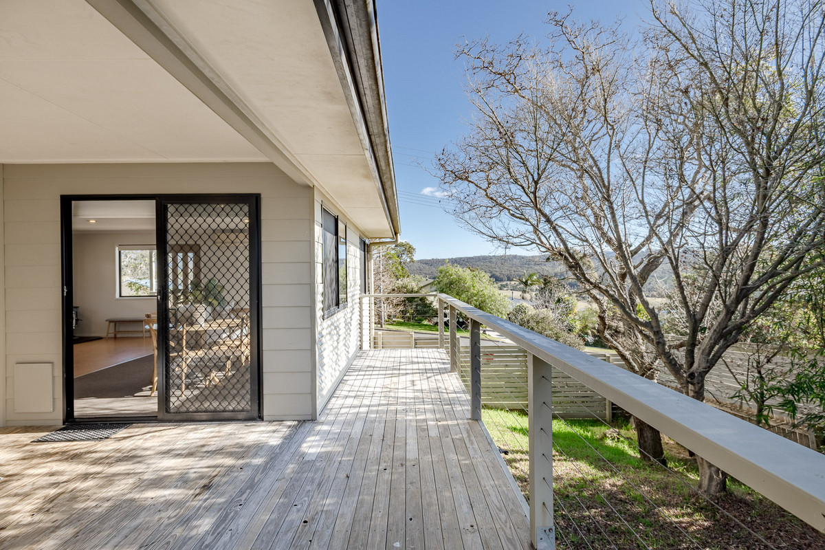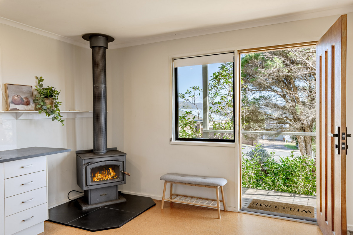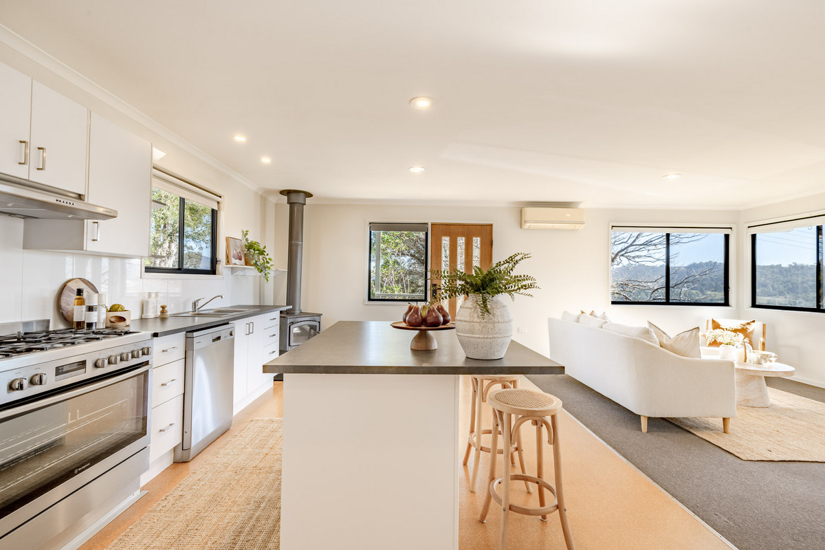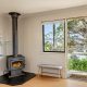 The open-plan kitchen/living/dining area is flooded with sunshine and natural light from its expanse of north-facing windows. There’s beautiful elevated views out over the Pambula flats and towards the Bald Hills and Millingandi hinterland beyond. There’s a wood fire and reverse-cycle air-conditioner, as well as block-out blinds in this space for ultimate year-round comfort.