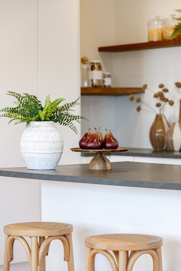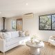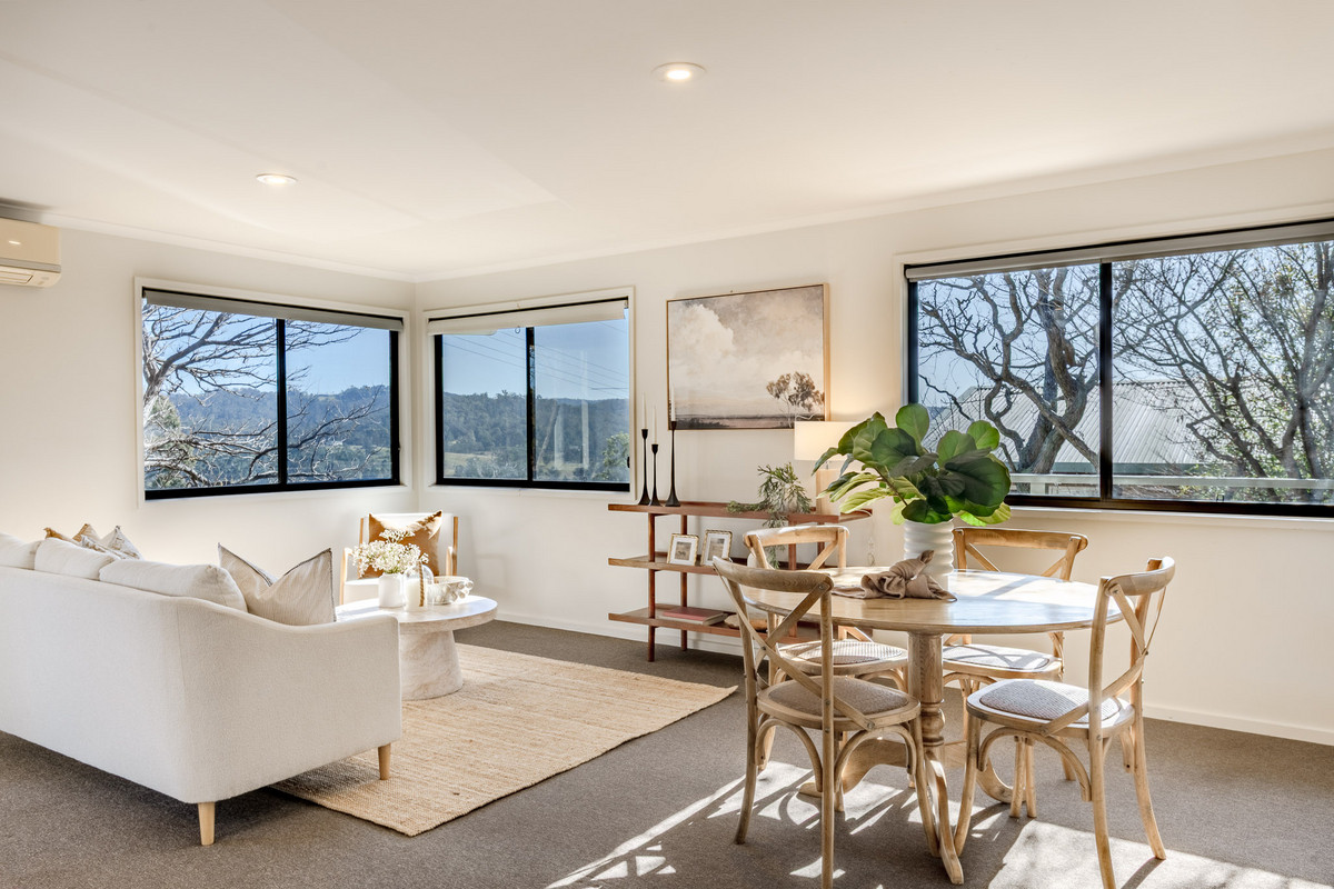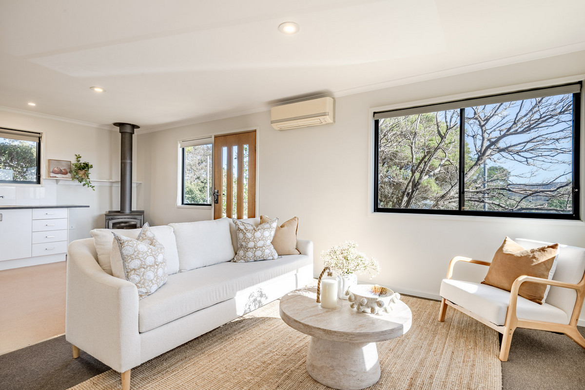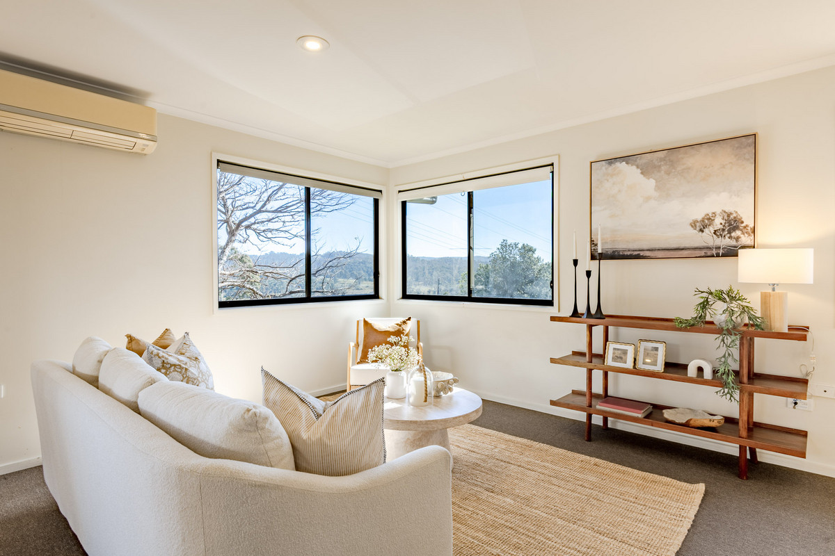 The open-plan kitchen/living/dining area is flooded with sunshine and natural light from its expanse of north-facing windows. There’s beautiful elevated views out over the Pambula flats and towards the Bald Hills and Millingandi hinterland beyond. There’s a wood fire and reverse-cycle air-conditioner, as well as block-out blinds in this space for ultimate year-round comfort.