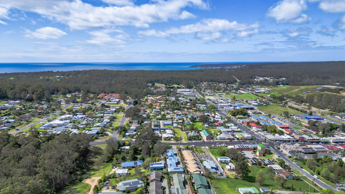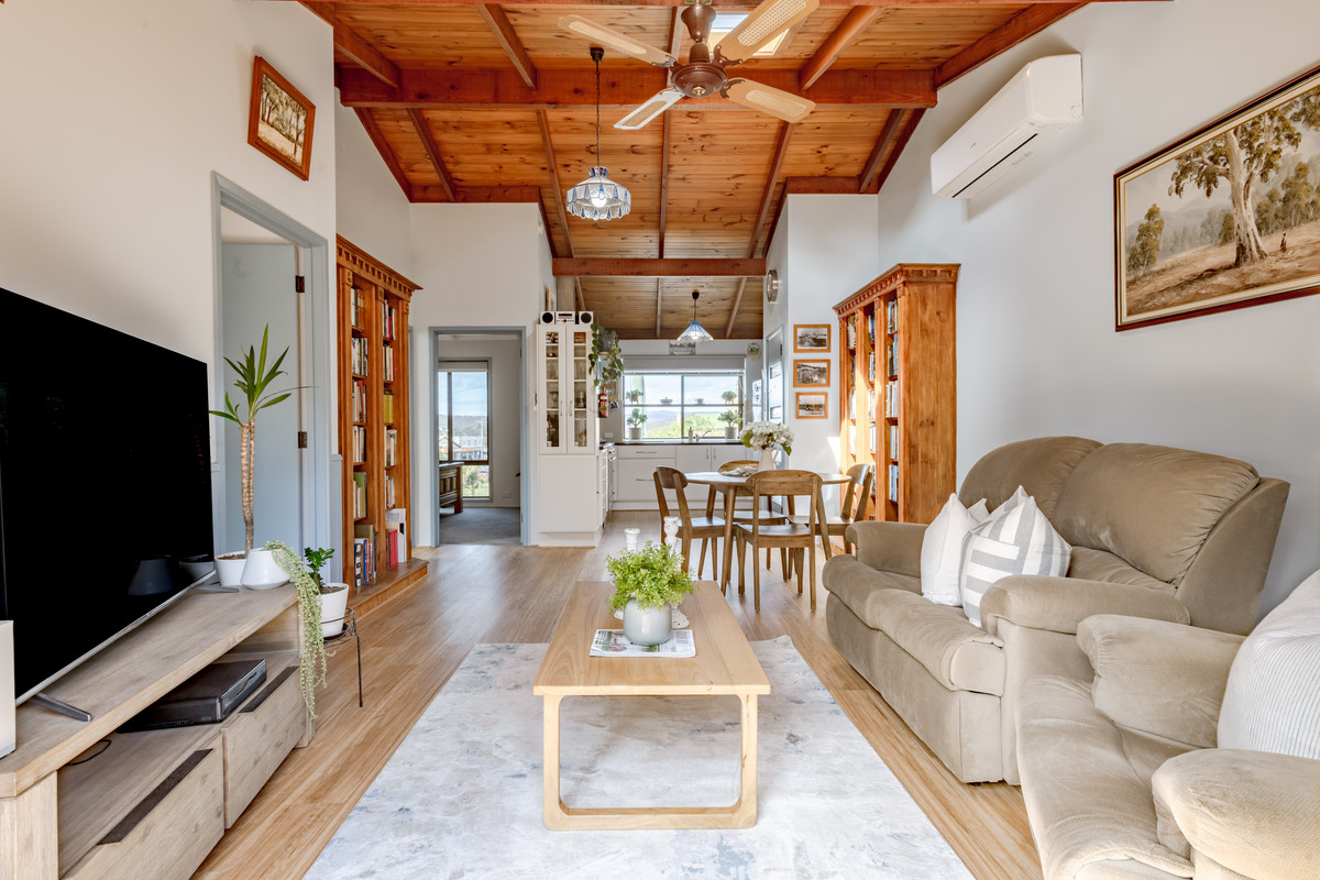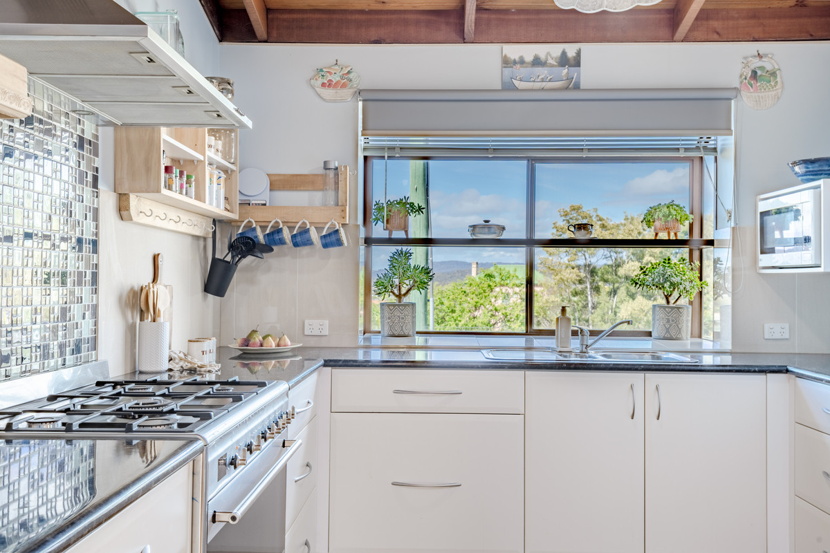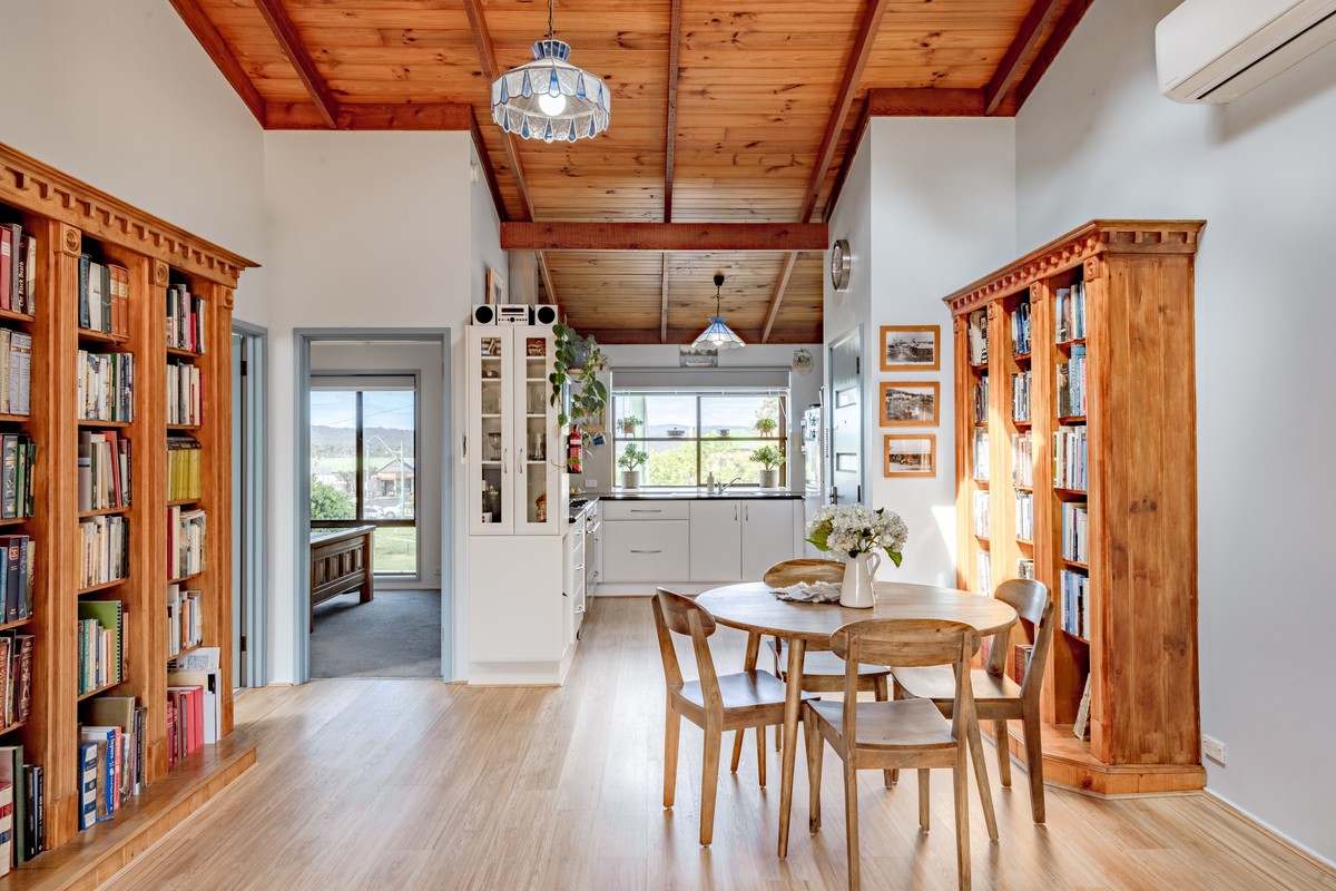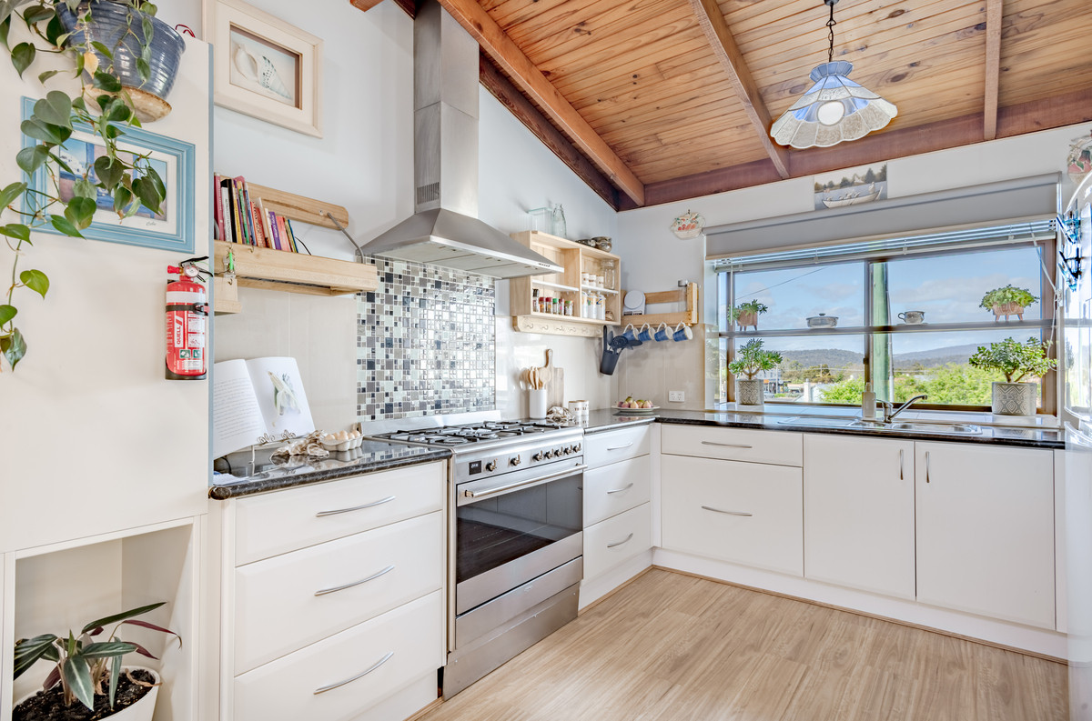 The generous bathroom includes a built-in laundry, while the updated kitchen is a true showstopper, with its oversized oven and cooktop, abundant storage, and a bay window that frames beautiful views over Pambula village.