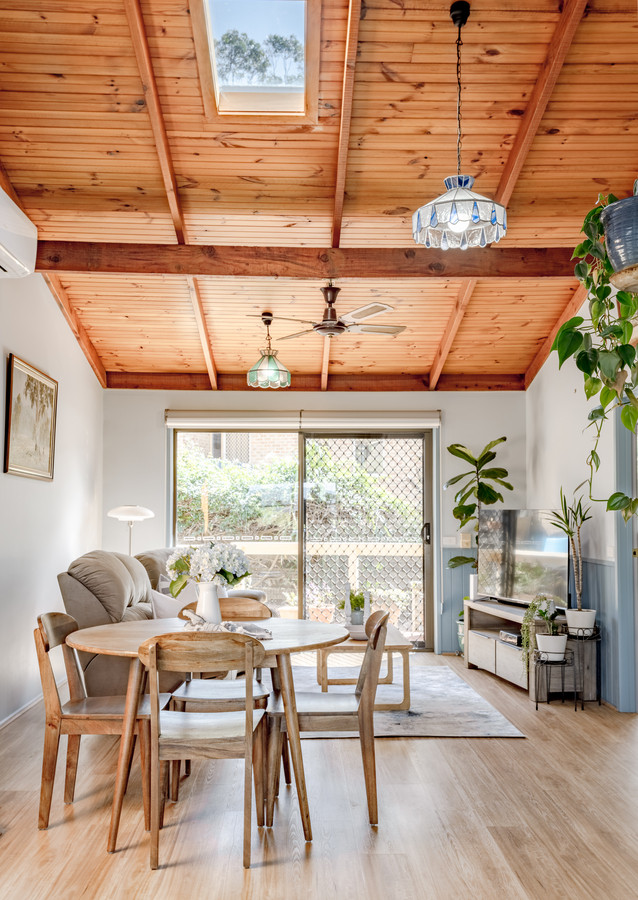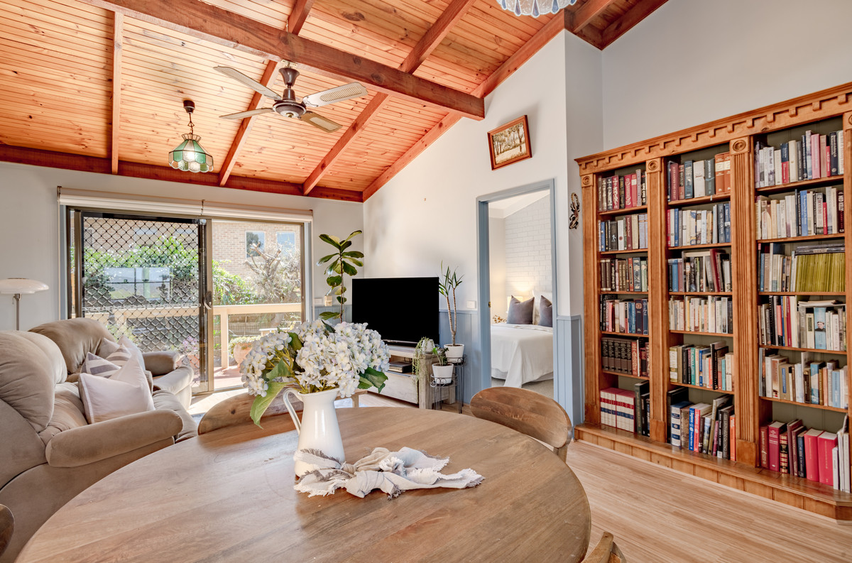 This two-bedroom townhouse is packed with features and character. Step inside and be greeted by soaring vaulted ceilings and warm timber accents that give the home an inviting feel.