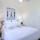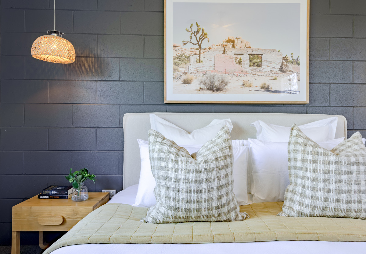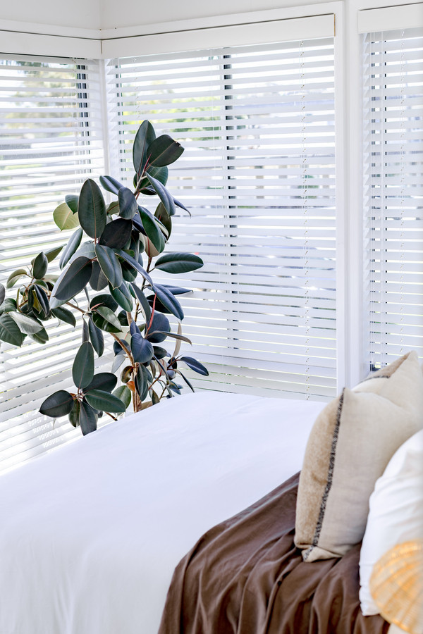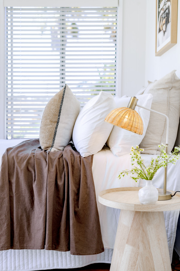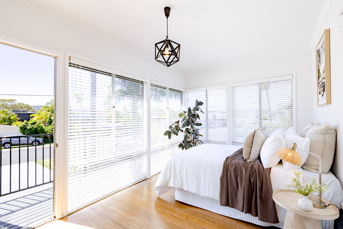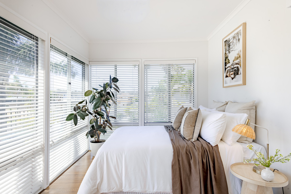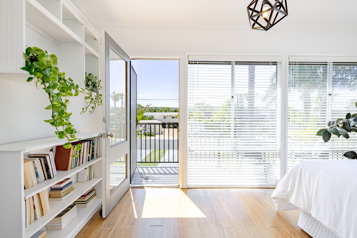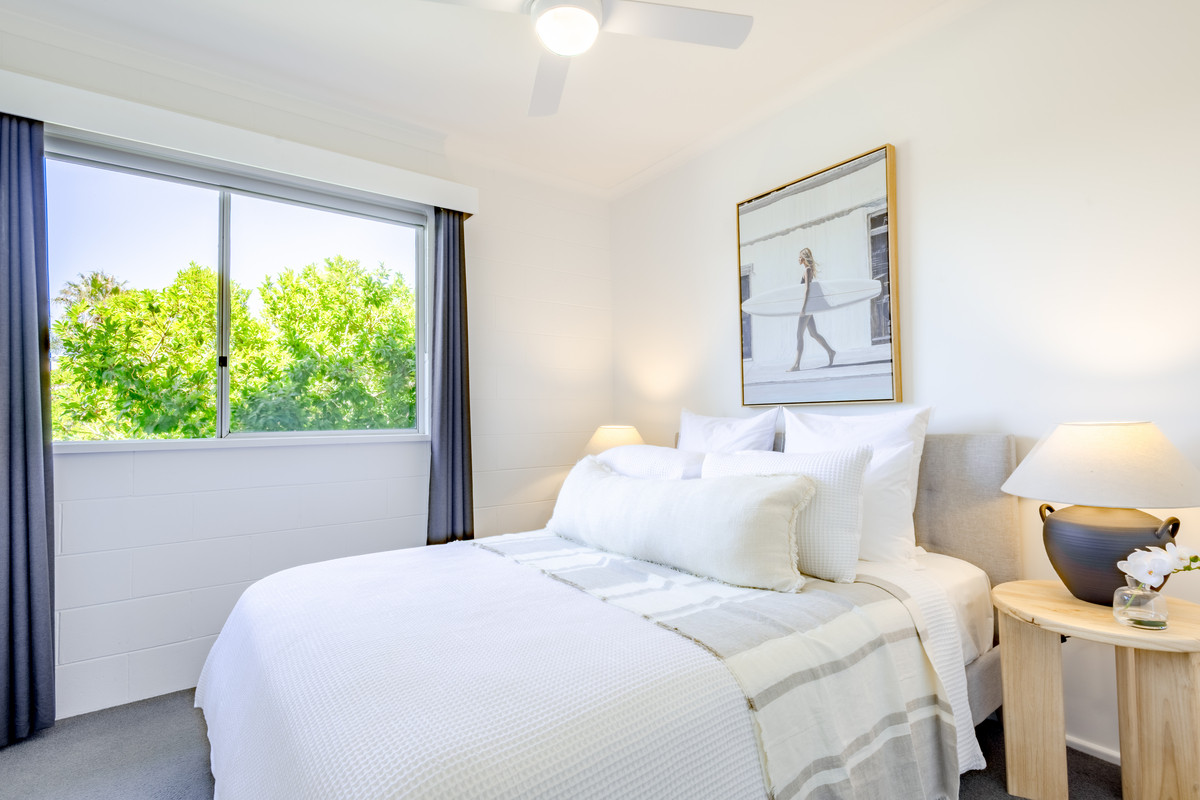 At the front of the unit, bedroom three is bathed in sunshine from floor-to-ceiling windows. This room would also be ideal as a home office or sunny second sitting room and has a sweet, sun-drenched balcony with glimpses of Merimbula Lake. The bedroom is fitted with white venetian blinds however there’s also a practical, external block-out blind on the north-facing windows in case the midday summer sun is too warm.