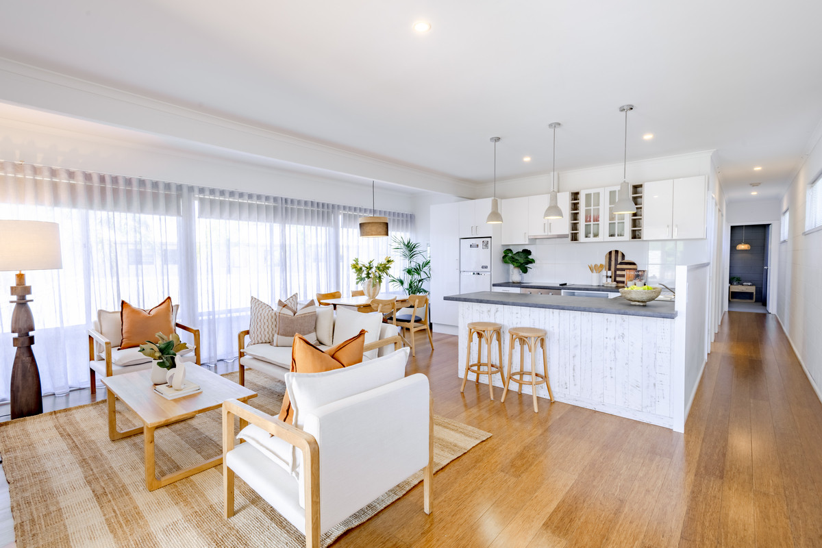 Down the hall are bedrooms one and two – both have ceiling fans – while the larger bedroom one has a double built-in wardrobe. There’s a fresh and modern bathroom – with space for a washing machine – a separate toilet and linen cupboard storage.