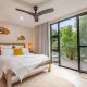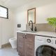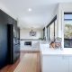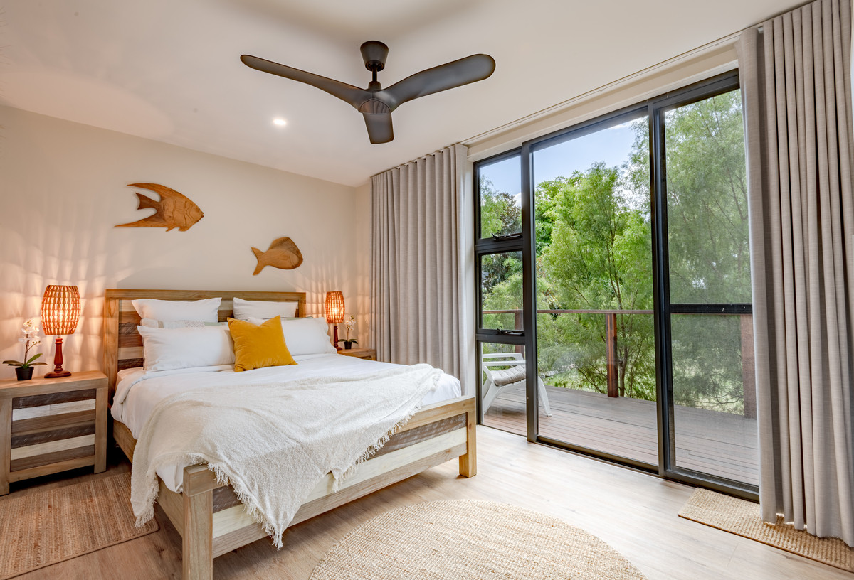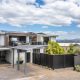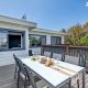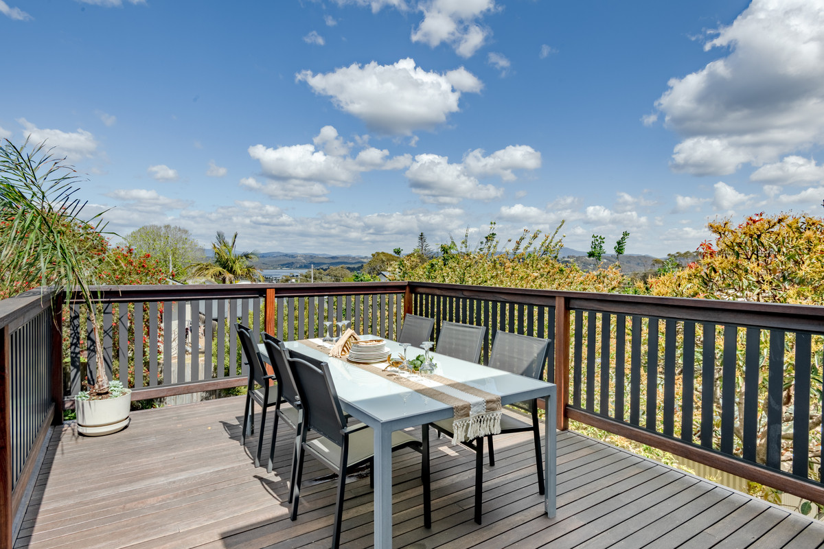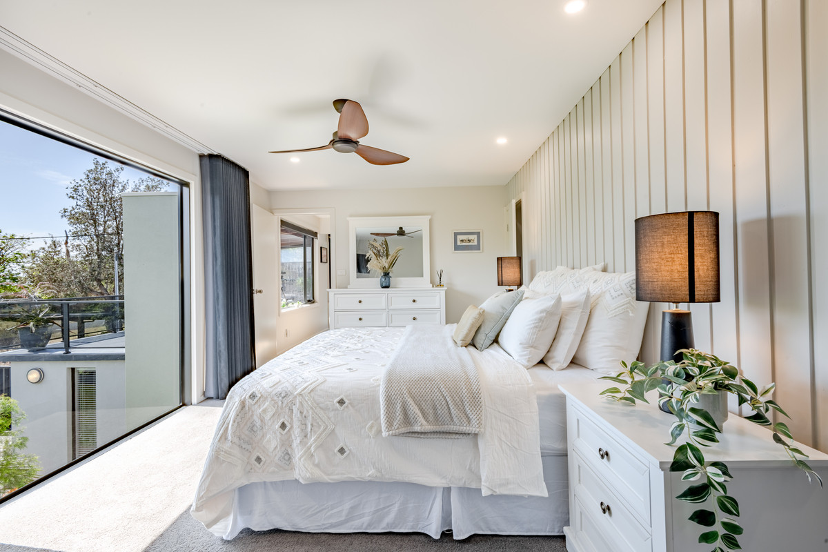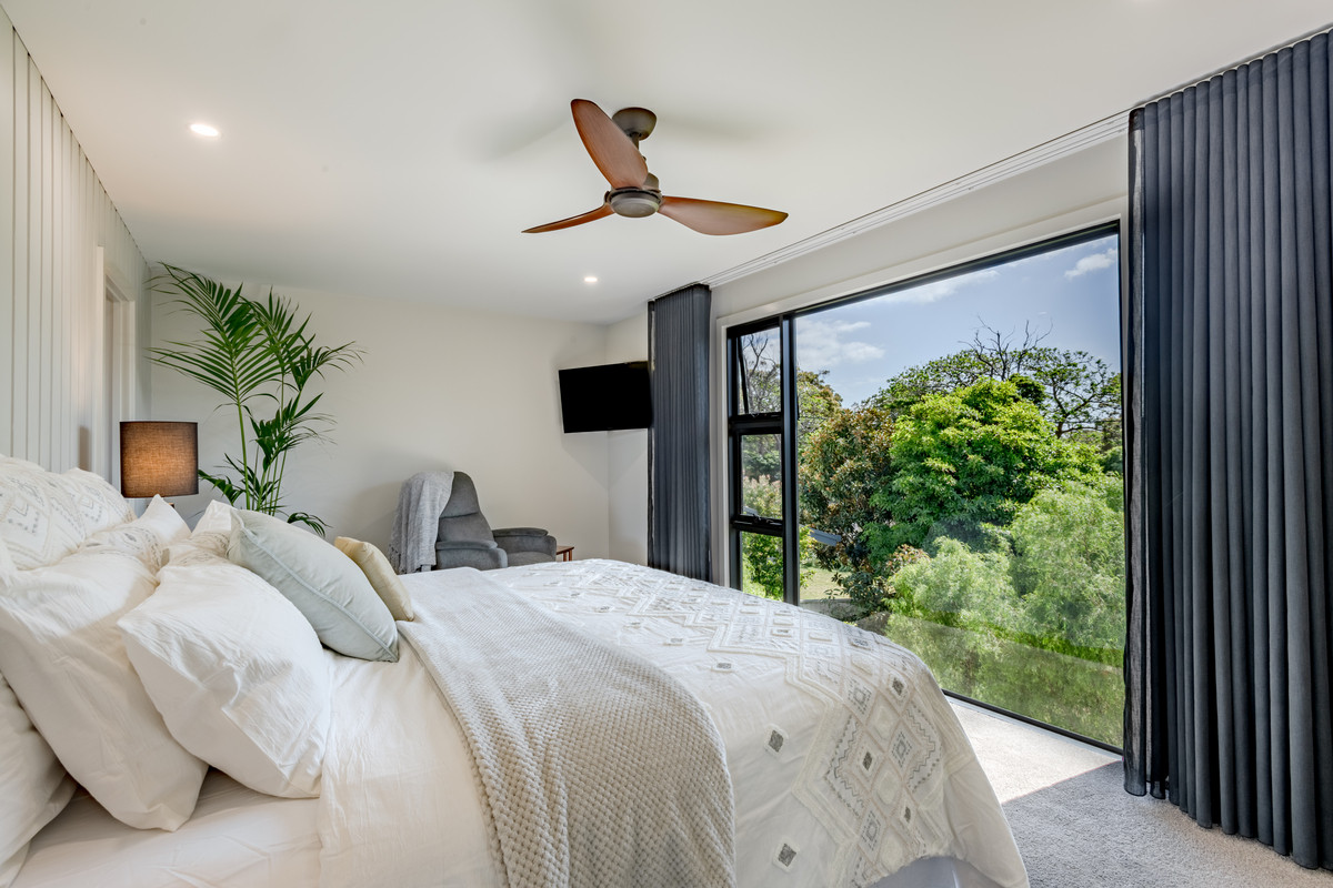 There are two generous decks off the main living space — a large, covered, north-facing entertaining deck with ample space for soaking up the all-day sun, as well as a south-facing deck with bi-fold servery window into the kitchen — ensuring entertaining and enjoying meals outdoors year-round in all weather is easy. The generous main bedroom suite also enjoys the stunning northern aspect allowing you to wake up with the sun to glorious elevated ocean views. There’s a large, luxurious walk-through wardrobe with bespoke, floor-to-ceiling cabinetry and an ensuite bathroom.