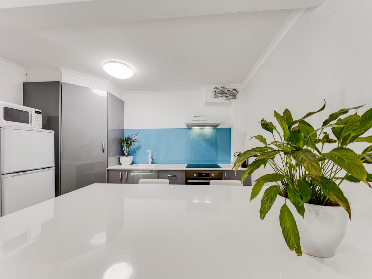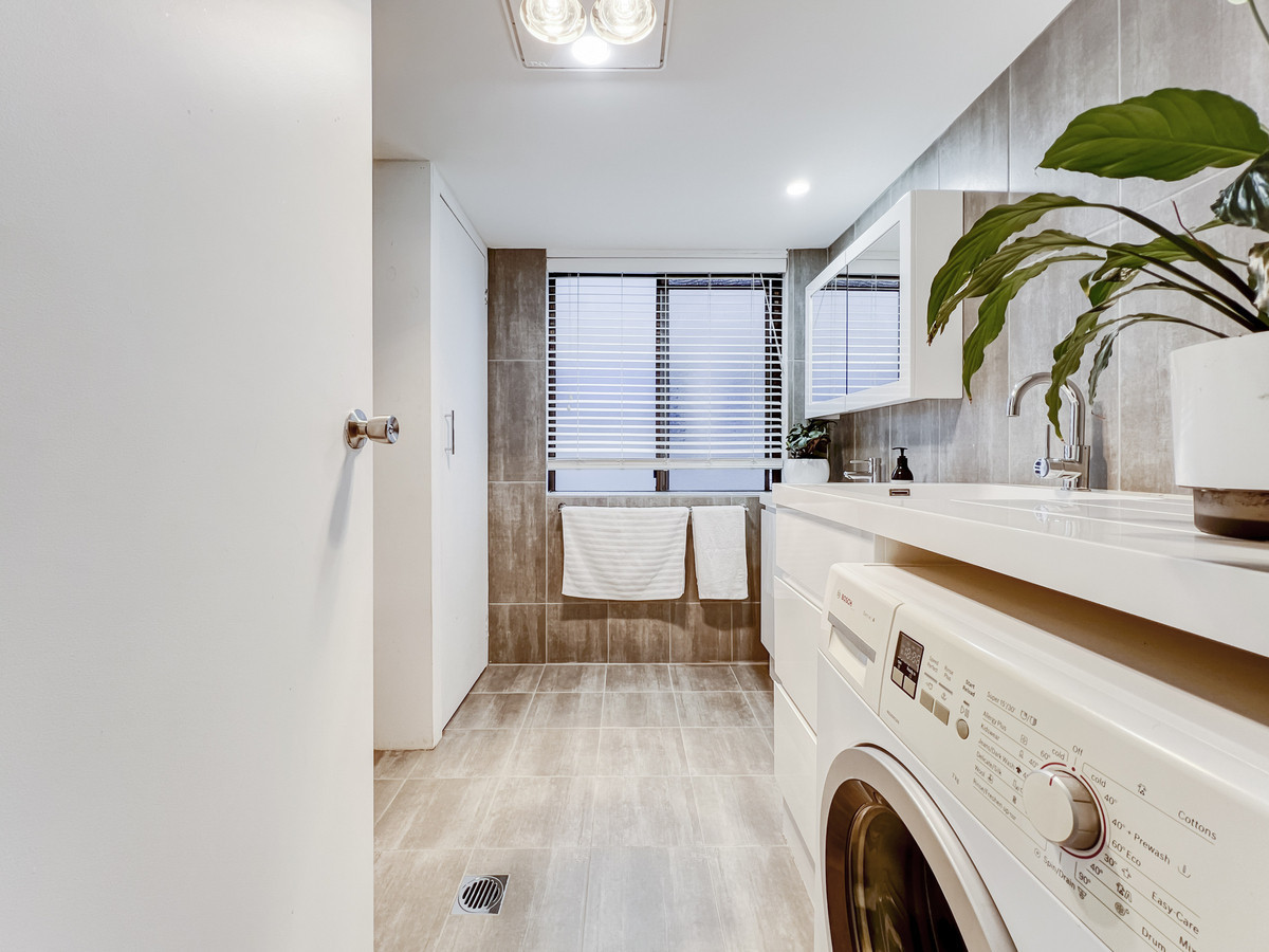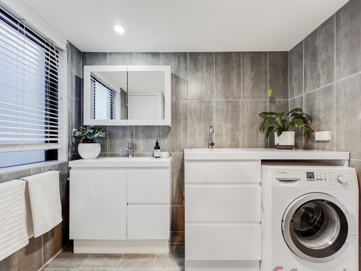 2 bedrooms with built-ins, kitchen with soft-close drawers and an induction cooktop, bathroom with floor to ceiling tiles, making great use of space with the laundry tucked in there as well. And the polished concrete flooring gives an inner-city feel to this charming coastal apartment. The living area is spacious with gas heating and sliding doors out to the sunny front courtyard.